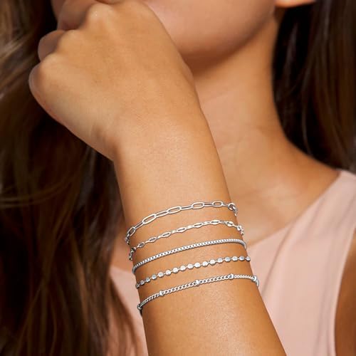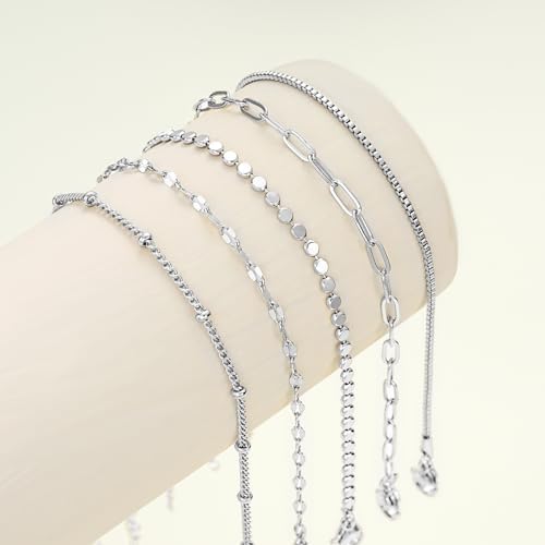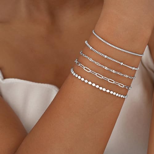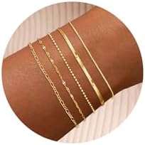 5 件金链手链堆叠套装女士时尚精致 14K 镀金卫星手链可调节薄回形针链可堆叠手链