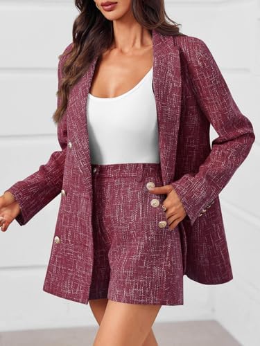 Cicy Bell 女式 2 件套粗花呢外套短裤套装长袖双排扣西装夹克商务装