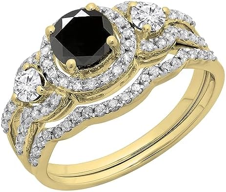 Dazzlingrock 系列 1.40 克拉 (ctw) 14K 金圆形黑白钻石女式 3 颗宝石光环新娘订婚戒指套装