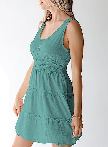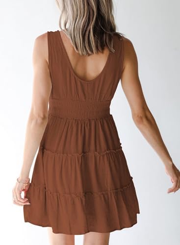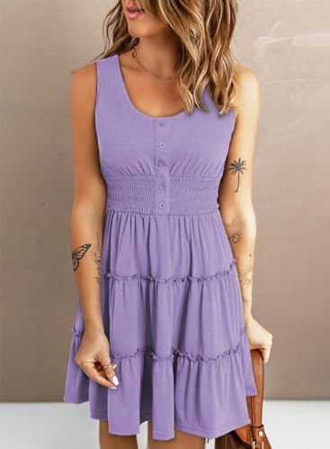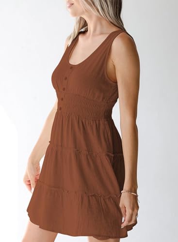Dokotoo 女式夏季连衣裙 2024 无袖系扣缩褶弹性腰褶皱分层休闲摆迷你连衣裙