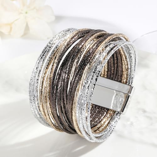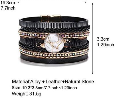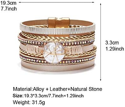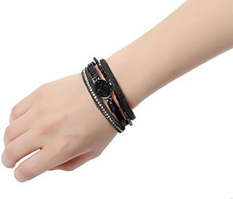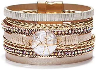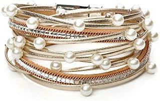 Fesciory 女式豹纹手链,波西米亚皮革包裹多层珍珠水晶手链手镯首饰