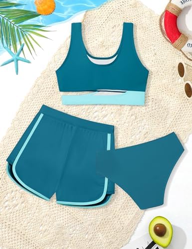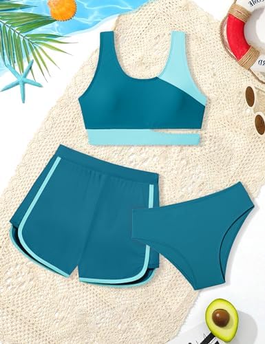 女孩泳衣比基尼套装,3 件套女孩泳衣拼色镂空泳装,带短裤尺码 7-16