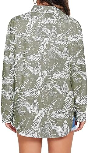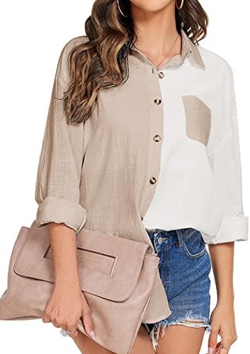 HOTOUCH 女式棉质系扣衬衫休闲长袖宽松有领亚麻工作衬衫上衣带口袋