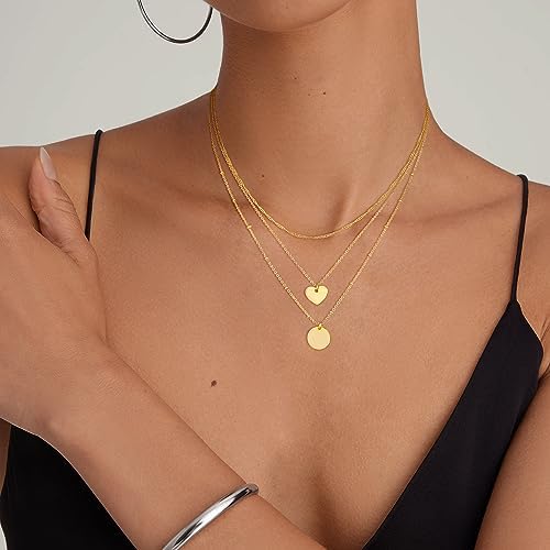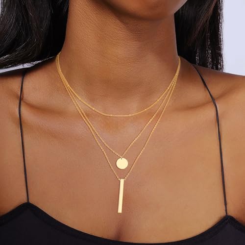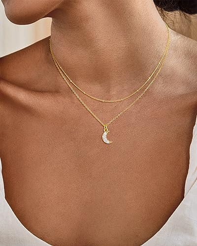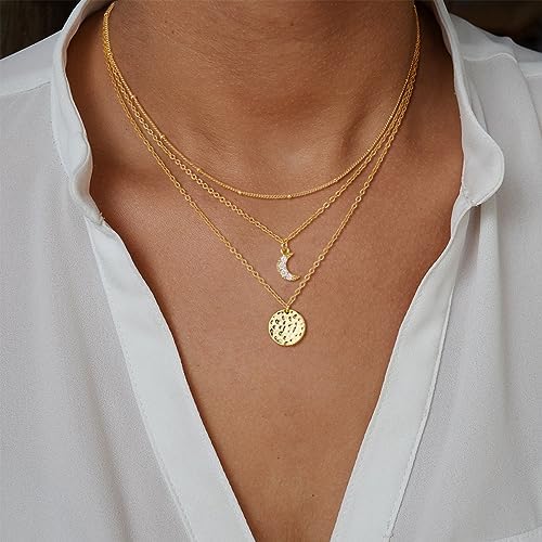 女士分层金色项链,可堆叠精致 14K 真金镀/银链项链分层海滩可爱时尚吊坠颈链时尚首饰套装,适合少女