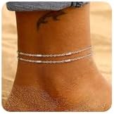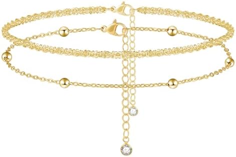 MIDEEO 女式金色/银色踝关节手链,14K 金脚链 防水古巴链心形串珠人字纹水钻脚链套装分层脚链手链女士金色珠宝礼品