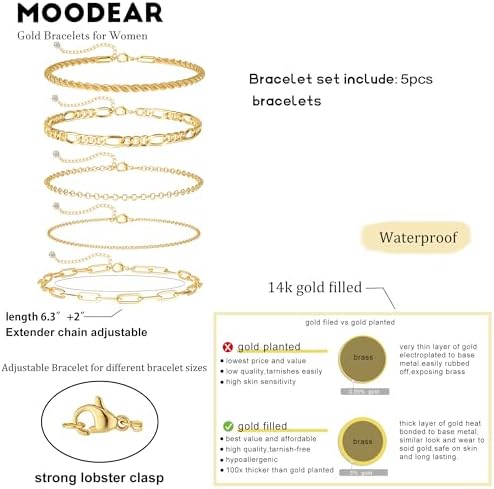 Moodear 精致 14K 镀金堆叠手链套装 女式 - 时尚可调节卫星袖口手镯手链包分层珠宝礼品