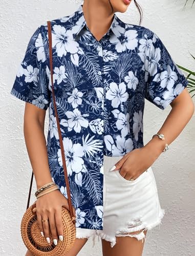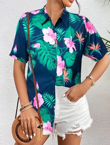 MYHALF 女式夏威夷衬衫柔软凉爽夏季夏威夷衬衫花卉热带印花 V 领 T 恤短袖纽扣上衣