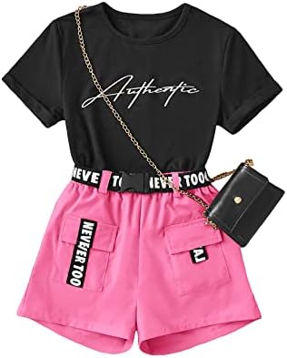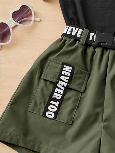 OYOANGLE 女孩 2 件套服装字母图案圆领 T 恤和带扣腰带短裤套装