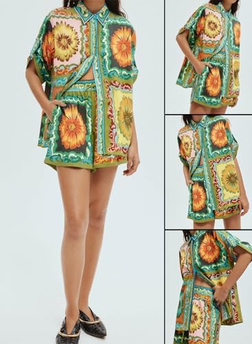 Peaceglad 女式印花 2 件套睡衣套装短袖系扣上衣抽绳短裤家居服睡衣套装