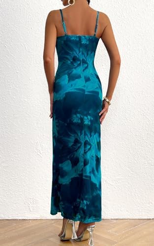 PRETTYGARDEN 女式 2024 夏季花卉细肩带超长连衣裙弹力性感紧身连衣裙露背吊带长裙