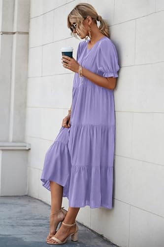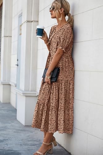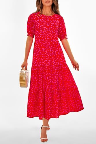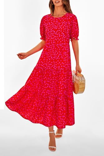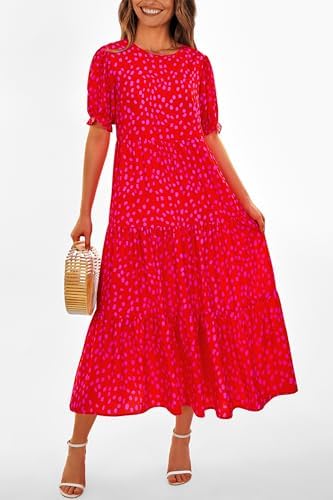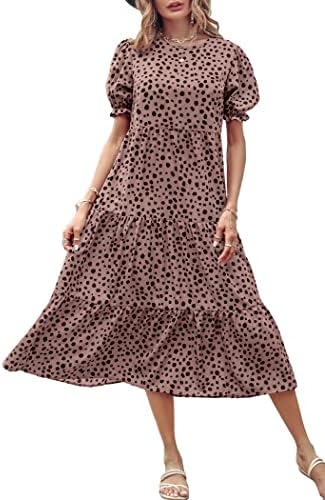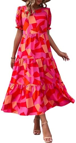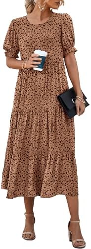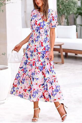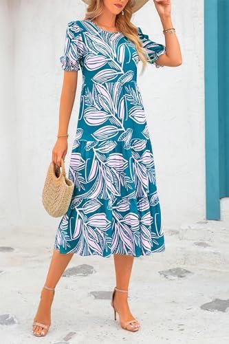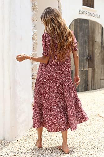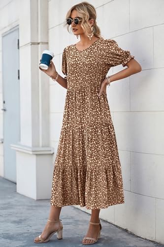 PRETTYGARDEN Women's Summer Casual Boho Dress Floral Ruffle Puff Sleeve High Waist Midi Beach Dresses