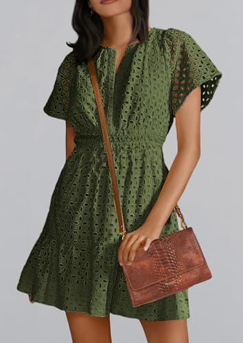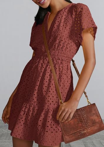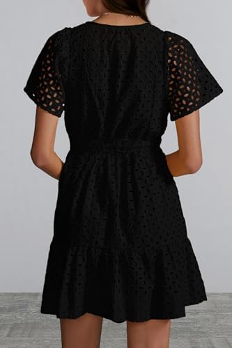 PRETTYGARDEN 女式 2024 夏季短款连衣裙 V 领短袖 A 字型镂空蕾丝褶皱可爱休闲沙滩派对礼服