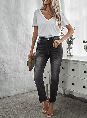 luvamia 女式七分牛仔裤高腰修身直筒弹力牛仔七分裤贴边口袋休闲七分牛仔裤