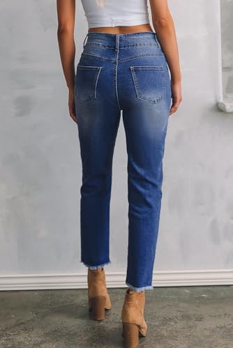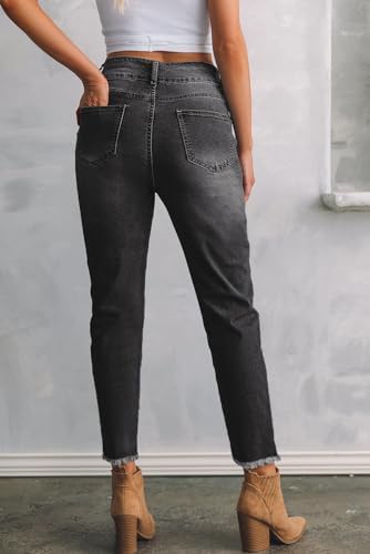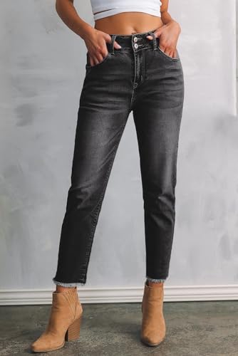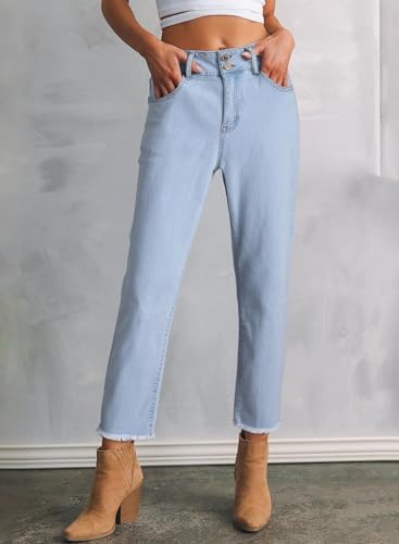 Sidefeel 女式高腰牛仔裤弹性毛边直筒牛仔裤带口袋