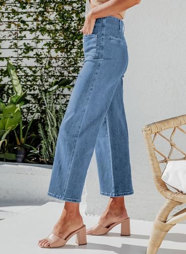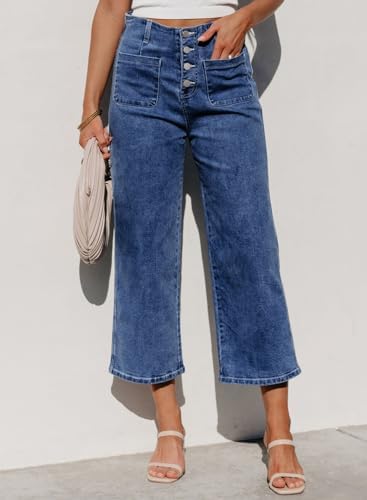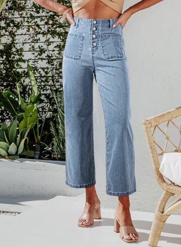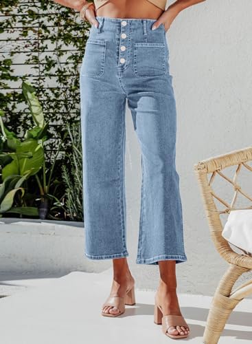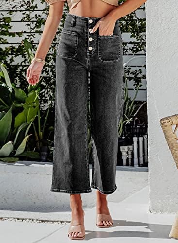 Sidefeel 女式阔腿牛仔裤高腰弹力直筒牛仔裤纽扣宽松牛仔长裤带口袋