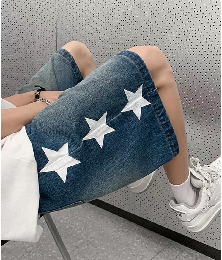 Y2K 蓝色牛仔短裤夏季休闲宽松直筒中性款宽松牛仔裤短裤 Jorts Grunge 原宿街头服饰