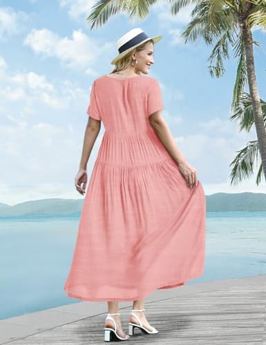 YESNO 女式休闲宽松波西米亚花卉连衣裙带口袋短袖长款夏季沙滩摆裙 EJF